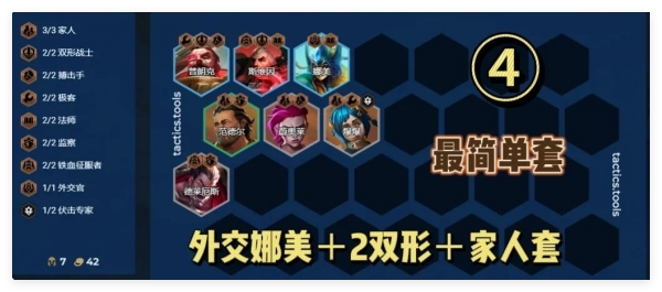 羁绊:3家人 2双形战士 2搏击手 2极客 2法师 2监察 2铁血征服者 1外交官